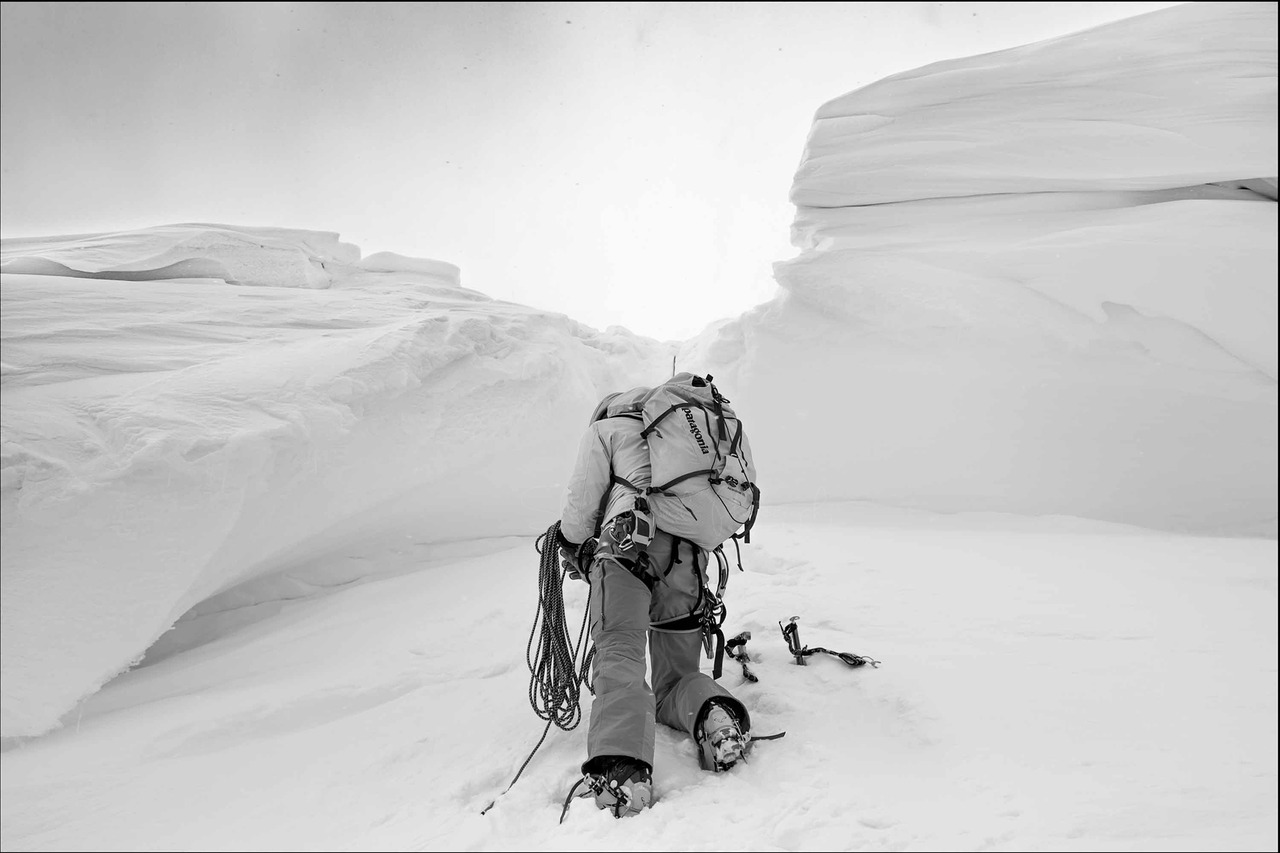 2017年3月19日、爺ヶ岳北峰西俣奥壁左リッジ~C沢、懸垂で左リッジに降り立ち、ロープをたたむSkialpinist氏。